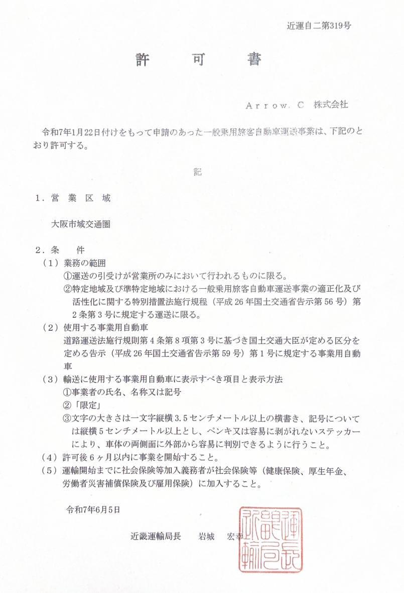Arrow.c株式会社大阪営業所は、関西を拠点に世界中のお客様へ最高のおもてなしをお届けするハイヤーサービスを提供しています。
